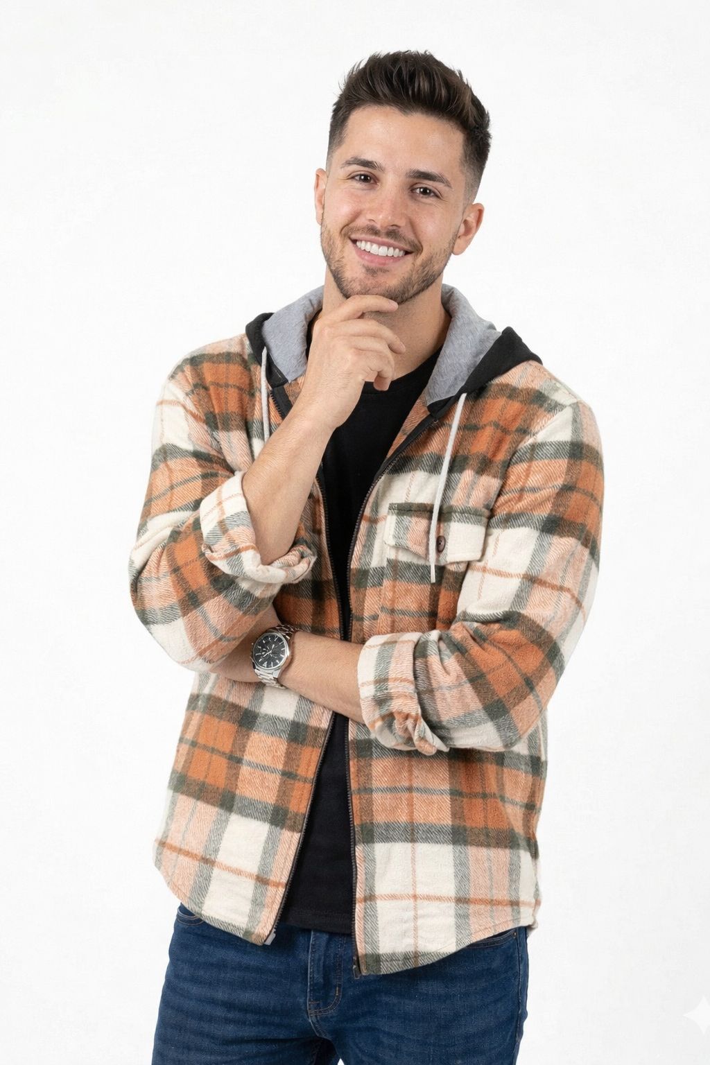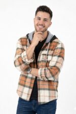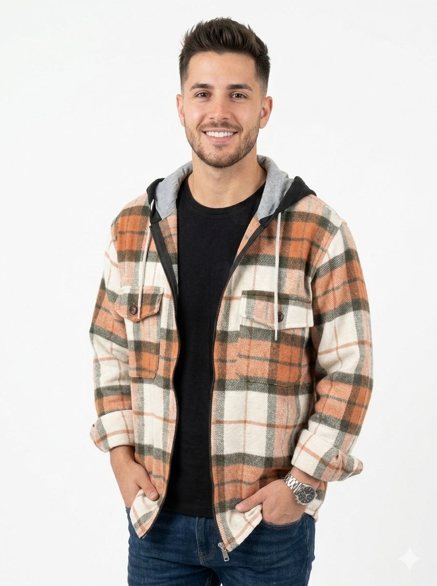 Nuestro camisaco de paño de invierno combina abrigo, estilo y versatilidad en una sola prenda. Con diseño cuadrillé naranja crema y verde, es ideal para looks urbanos con personalidad.