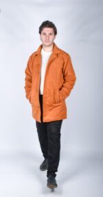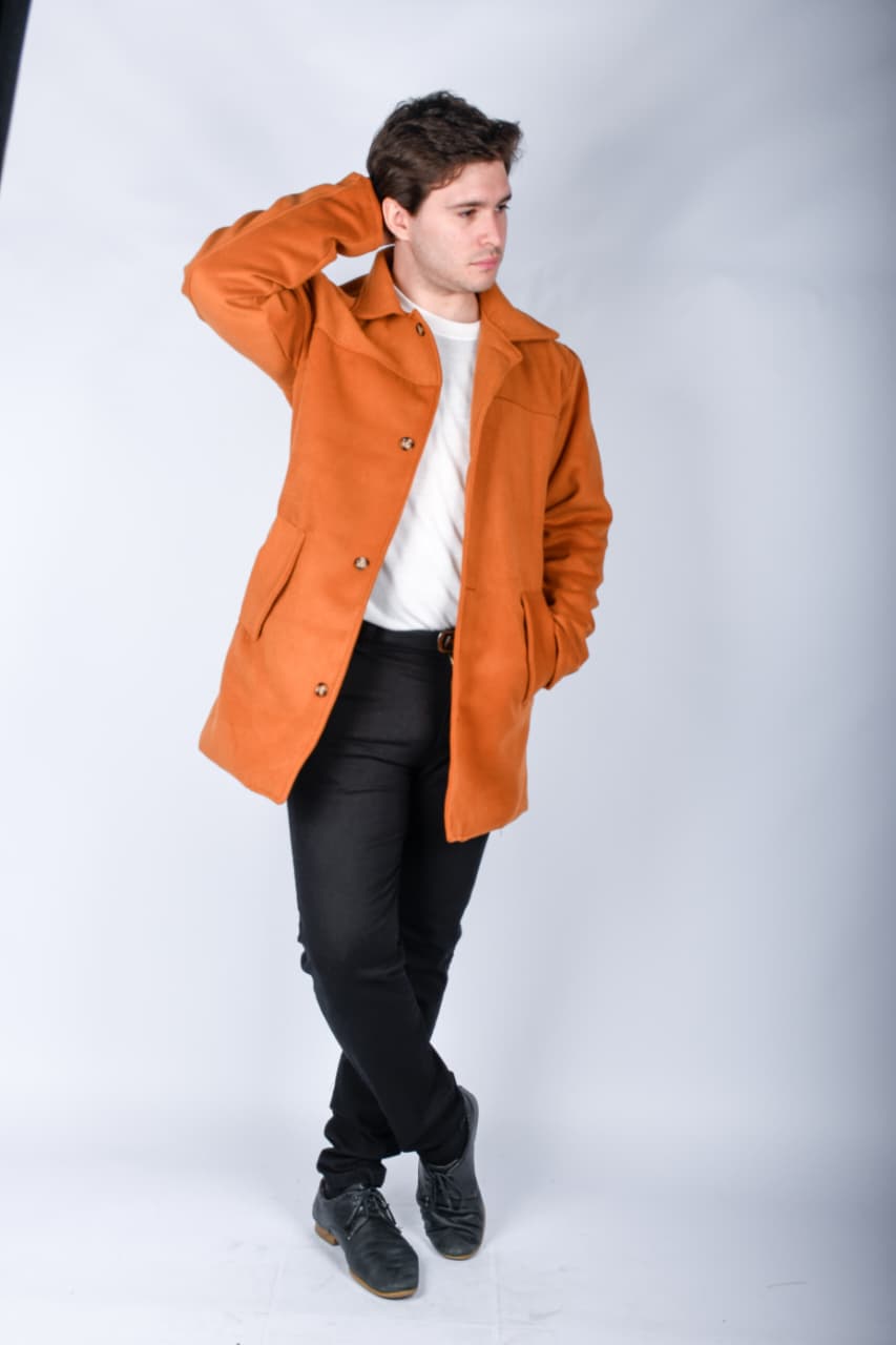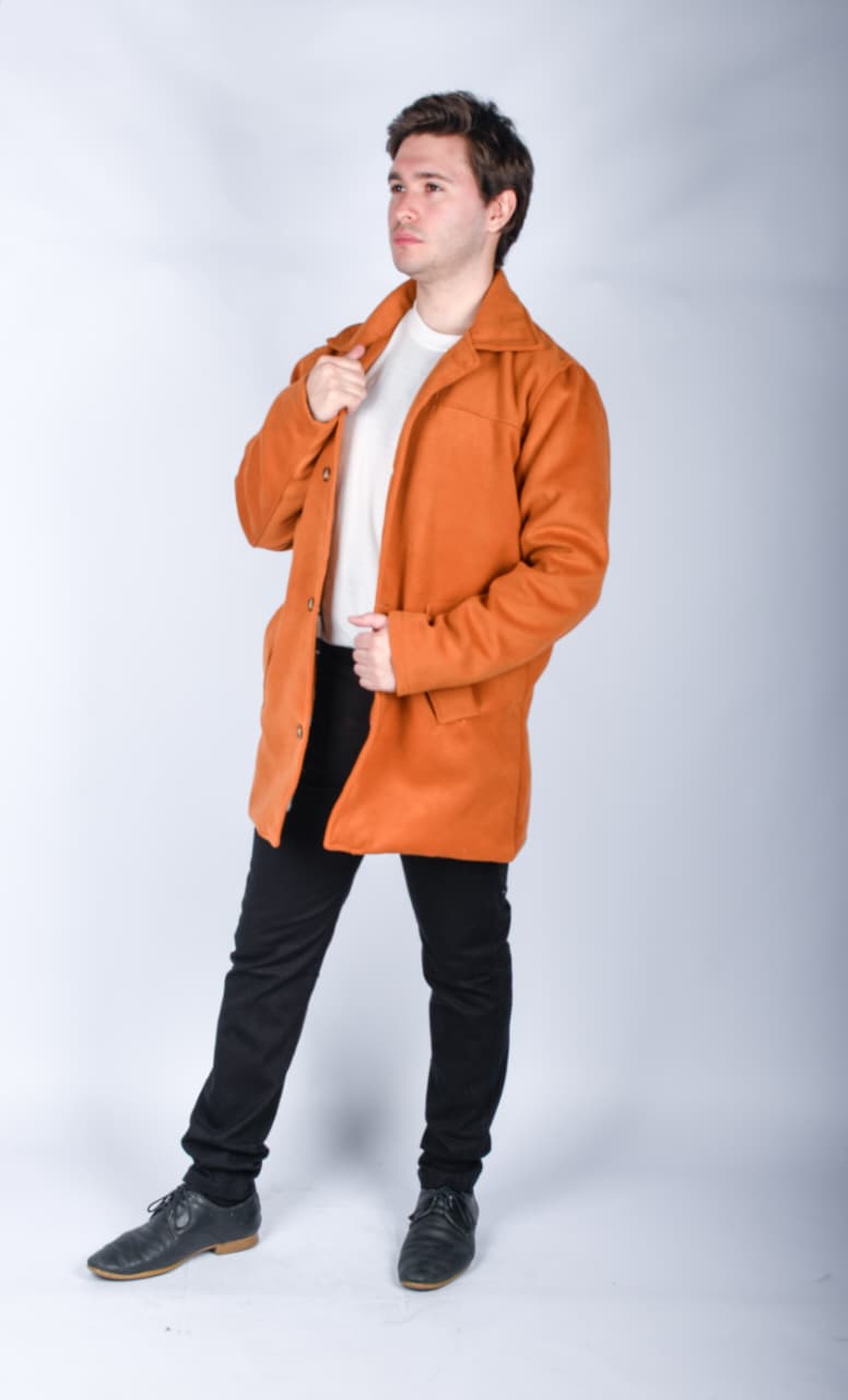 Este saco de paño en color naranja vibrante es la pieza clave para quienes no temen ser el centro de atención. Combina una silueta clásica de sastrería con un color enérgico que levanta cualquier outfit invernal al instante.